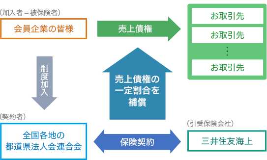 法人会専用に設計された団体取引信用保険で、全国各地の都道県法人会連合会が保険契約者、法人会会員企業の皆様が加入者(被保険者)となる団体契約です。